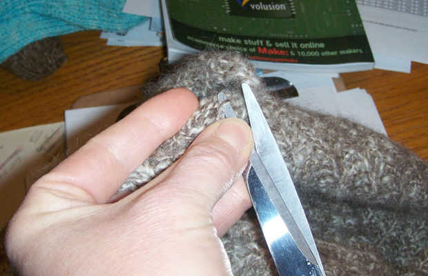 Si las costuras son super ajustadas, tomar un par de tijeras con puntas muy filosas y Deslice cuidadosamente un punto por debajo de una de las puntadas de costura y lo corte. Asegúrese de que no cortar en las porciones punto del suéter. Cuadro 4 muestra el snip realizado.