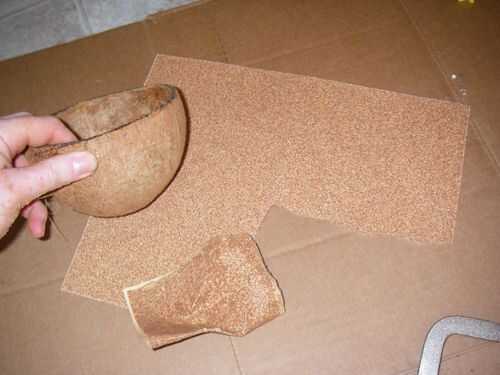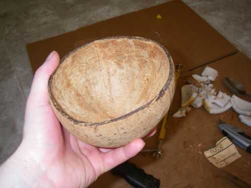 Para acabar con la textura y preparar el recipiente para barnizado/impermeabilizaciones, toma una hoja de grano áspero 6 x 7 de papel de lija y rasgue en cuartos, después doblar uno de estos más pequeños hojas dobles. Arena por el interior del recipiente hasta que se siente suave y allí son ningunos pedacitos sueltos de coco "pelo" cuando corres tus dedos en el interior. Igualmente con el exterior, que llevará más tiempo y requieren una segunda hoja de papel de lija, ya que hay mucho más "pelusa" para quitar. Yo sugeriría también lijado hacia abajo el borde de su tazón de fuente, ya que puede beber de ella más adelante.