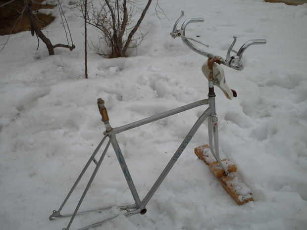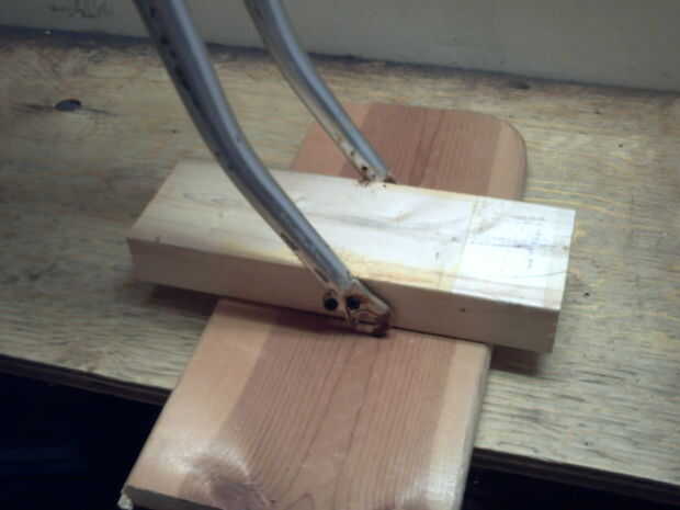 Hacer un soporte para la horquilla delantera. Esto puede hacerse bastante rápido y fácil por colocar a algunos madera antigua como una pieza de 2 x 4 y 2 x 6 como se muestra con algunos tornillos. Esto le permitirá mantener su animal bicicleta estable mientras trabajas en él. Una vez terminado y sentado en el patio, los niños a veces intentan subir en su Reno bicicleta lo mejor para que sea estable.
