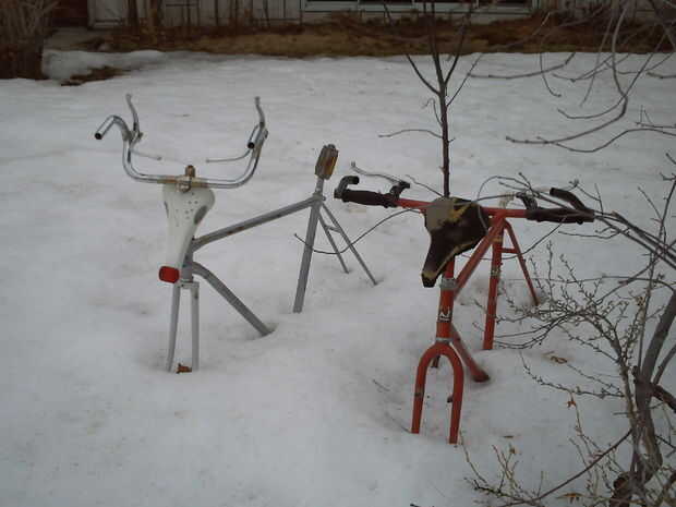 Opciones: Antiguos bares de estilo de 10 velocidades con las palancas de freno secundario dan el mejor look para Reno - con el cuerpo completo o sólo un montaje de la cabeza. Bicicletas de montaña con el extra bar extremos puede hacen un alce decente. Viejo solo o 3 velocidades roadster o crucero manillar estilo hace un ciervo justo o dirigir la mirada. Son tres ejemplos (renos, alces, venados) en las imágenes.