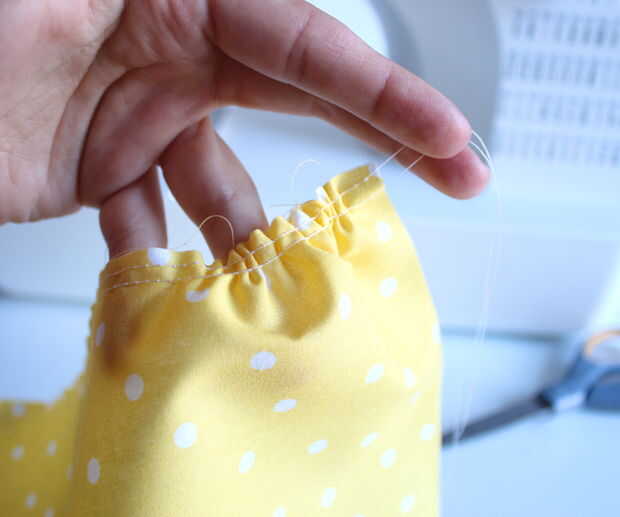 Que va a utilizar las cuerdas superior - grab dos de ellos con su mano derecha y tire la tela hacia usted con su mano izquierda. Verás empezar a recoger. Hacer esto en el otro lado y seguir adelante hasta llegar a la longitud que desee.