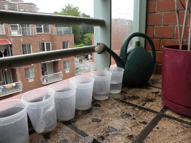 Y en cuanto a las algas que crecen en los contenedores de plástico transparente, ha estado usando esta colección de agua de lluvia para el mes pasado y no han encontrado ningún problema. Ya que mi colección está en una pequeña cantidad, utilizo el agua relativamente rápidamente. Además, mi terraza orientada al norte recibe poco sol, y el agua se mantiene en la esquina, así que esto es probablemente por qué las algas no plantean un problema para mí.