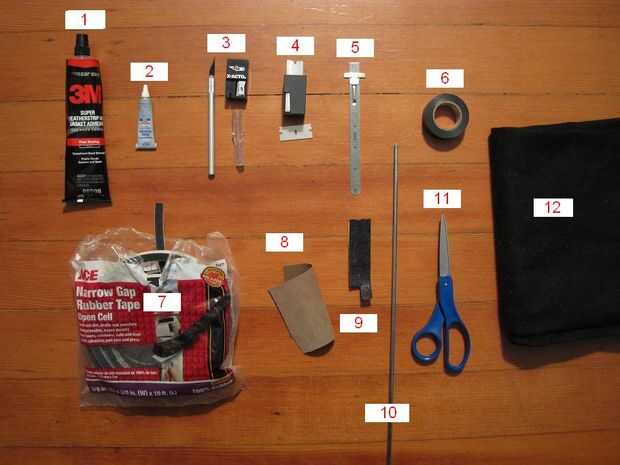 7.) brecha angosta cinta de goma, 3/8" de ancho por 3/8" espesor, abierto de la célula.  He utilizado la marca Ace.  No puedo garantizar que cualquier antigua marca funcionará.