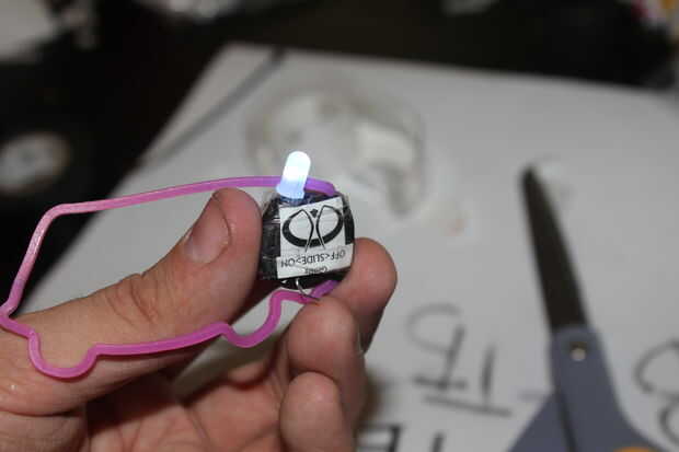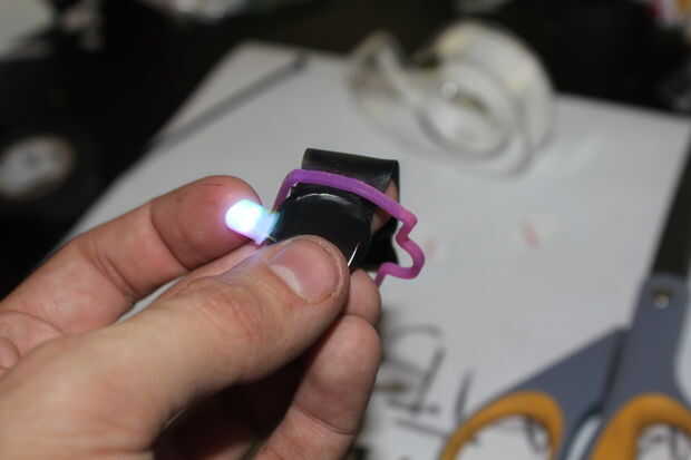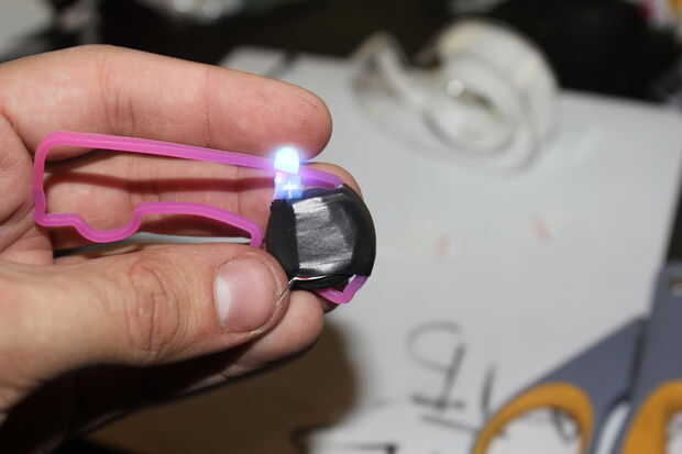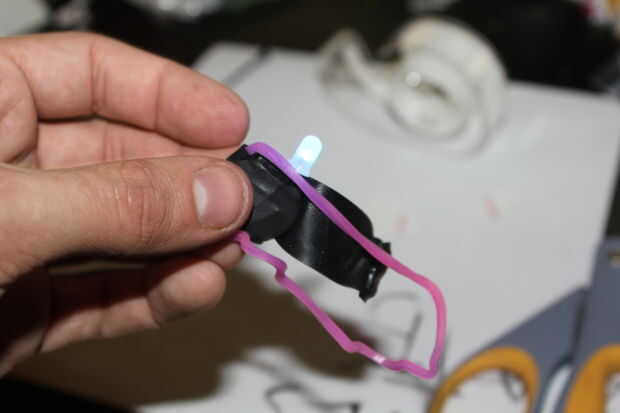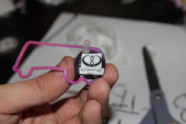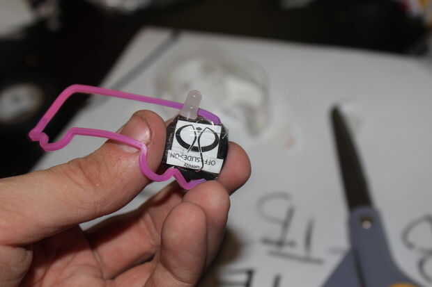 Preferentemente utilizando la misma pieza sin corte de cinta, encontrar un lugar de curvado en el diseño de goma para la batería descansar, descansar en la esquina y luego pre-estiramiento attatch justo en el borde la cinta alrededor de ella (toma algunos finesse, pero ensuciarse la cinta sobre la banda y luego estiramiento para apretarlo... de diapositivas)