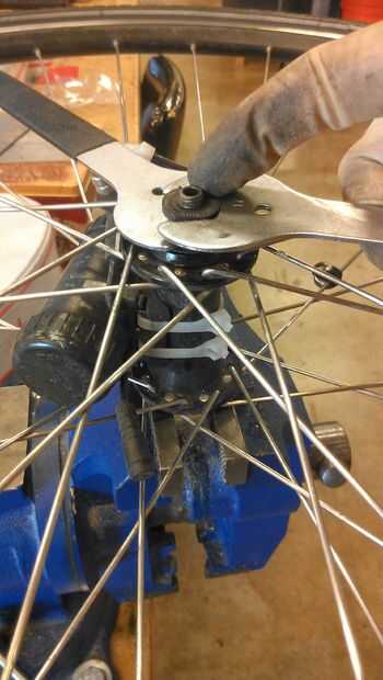 Esta es la parte donde realmente necesita práctica para hacerlo bien. La necesidad de conos ser espaciadas perfectamente para asegurar el cojinete de bolas no se están reduciendo en sus pistas, pero no puede existir ningún espacio extra para los rodamientos a mover alrededor. Apriete a mano, luego detrás de él apagado (no más de un cuarto de vuelta) hasta el eje ondulará alrededor en el centro un poco pequeña teensy, luego bloquearla hacia abajo con la contratuerca usando las llaves de cono. Esto ayuda a tener el otro lado en un vicio si tienes uno. Esto le permite usar ambas manos en las dos llaves y el eje no gire. Una vez que trabar, tomar el eje y girar con los dedos. Se debe girar muy suavemente con muy poco esfuerzo, pero no mueva en todos cuando intenta moverse alrededor. Esto requiere práctica y no debe hacerse descuidadamente. Puede arruinar su eje si se hace demasiado Prieto o flojo. Si usted no puede conseguir apenas a la derecha, ahora es el momento de pedir ayuda. El hub puede llevarse más allá de la reparación.