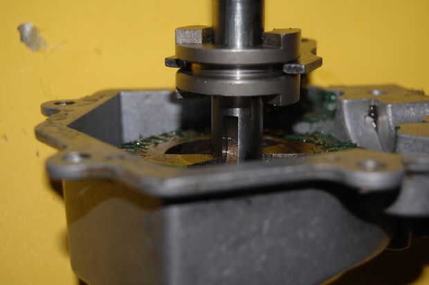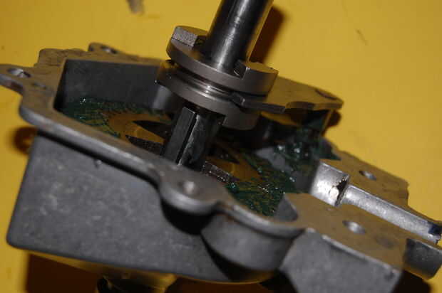 Ahora que se ha realizado la limpieza y las partes todas establecidas todo está preparado para ser montado, lubricado y sellado. Lo primero que tienes que hacer es que vuelva el retén y empujar la varilla de la palanca de cambios en el caso de de que se acaba de quitar. Para ello, un par extra de manos hacer esto muy rápido y sin esfuerzo. Primero ligeramente frote una muy pequeña cantidad de grasa en la primavera y vuelva a colocar el resorte en su agujero, luego el rodamiento de bolitas en la parte superior del resorte. A continuación, aplique una pequeña cantidad de grasa en las dos muescas de la varilla de la palanca de cambios. Comienzo la varilla en el agujero de la palanca de cambios desde el interior de la caja con el "tenedor" también dentro de la caja. Ahora con la ayuda de otra persona, utilizar su ayudante que presione el cojinete en el agujero contra el muelle a través del orificio de drenaje al otro lado del cojinete, usando una llave Allen de 3/32". Empuje la varilla de la palanca de cambios a la llave Allen y mantener la presión de la varilla de la palanca de cambios mientras su ayudante quita la llave, empuja la varilla a través de "bloquear" el retén en su sitio detrás de la palanca de cambios. Puede que necesite golpee ligeramente el extremo de la varilla de la palanca de cambios donde se une a la horquilla con un mazo de goma para manejar completamente a través del agujero en su primera posición de bloqueo, tan solo un clic. A continuación, deslice la camisa de cerradura del eje de salida en el tenedor. No importa qué lado quede frente a usted puesto que ambos lados son idénticos. Ahora, deslice el eje a través del buje y la arandela espaciador plano y el primer engranaje grande dentro de la caja y guía de la manga de cierre sobre el eje. Alinee el orificio en el anillo de bloqueo con la clave grove en el eje, introduzca la llave extraíble en el eje y presione el anillo de cierre sobre la clave y el eje en la segunda posición de la palanca de cambios.