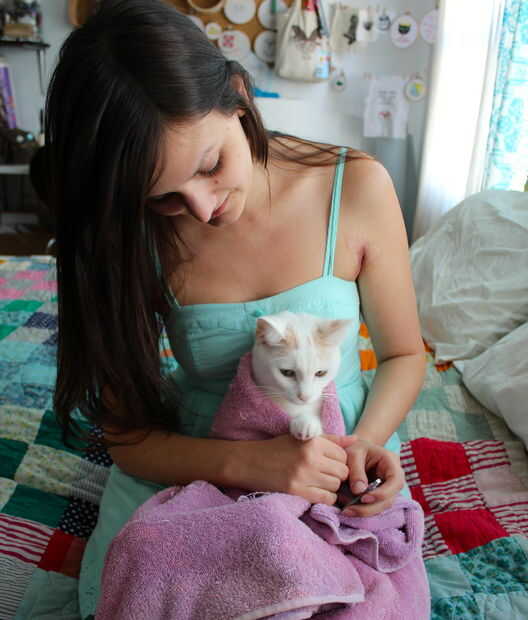Envuelva alrededor del gato firmemente, dejando sólo su cabeza y la pata que está podando sobresale la toalla.