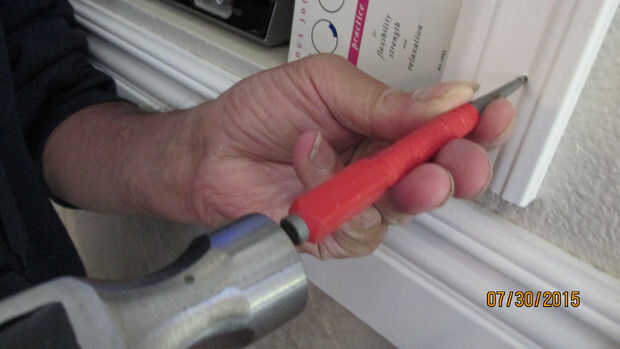 Después de determinar que todas las piezas son de colocación y la longitud correcta, es hora de poner todo junto. Usar clavos o pegamento, sujete la moldura y rosetas a la pared. Para ocultar las cabezas de los clavos, utilice un clavo y un martillo la cabeza del clavo por debajo la superficie para posteriormente llena de lápiz sellador o cera. (Incluso puede pintar sobre la masilla en un punto posterior en el tiempo).
