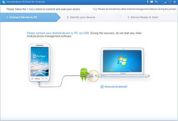 Ejecutar el programa en tu PC y cuando la primera pantalla se hace visible, conecte su dispositivo Android a su computadora portátil o de escritorio PC usando un cable de USB estándar de la industria.