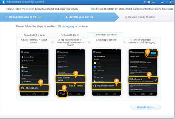 Punta: Si tu dispositivo Android se ejecuta en las versiones 4.2 o posteriores, pulse "Configuración" > ir a "Acerca del teléfono" > Pulse "Número de compilación" para sobre 7 veces hasta llegar a la notificación "Estás en modo developer". Ahora volver a la configuración de nuevo haga clic en "Opciones de desarrollador" > y "Depuración USB".