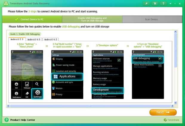 Antes de la exploración, usted debe habilitar la depuración de USB. Los pasos para otra versión de Android, así que siga las instrucciones correctamente, se muestra en la pantalla de software, además, debe activar almacenamiento USB. Sólo tienes que seguir los pasos para terminar para su dispositivo según la guía en pantalla.
