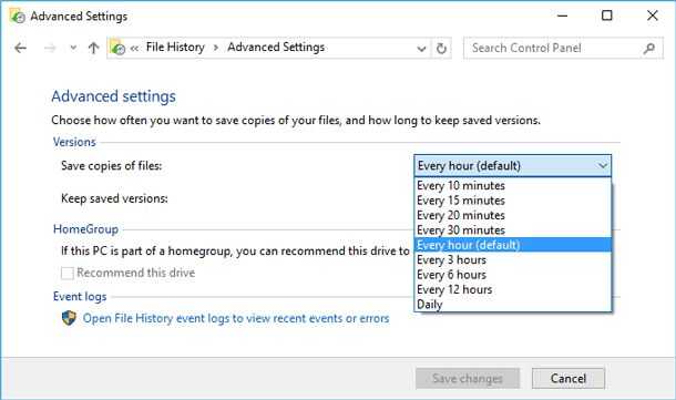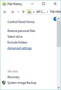 Puede ejecutar un ajuste más fino de backup de datos en configuración avanzada de la historia del archivo, que se puede acceder haciendo clic en configuración avanzada en el panel izquierdo.