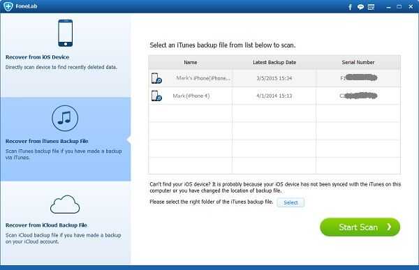 Seleccione la segunda opción de la interfaz principal de recuperación de datos iPhone. Podrás ver todos los archivos de copia de seguridad iTunes en su computadora. Elija la última para tu iPhone escanear. Haga doble clic en el archivo de copia de seguridad y el software buscará lo rápido.
