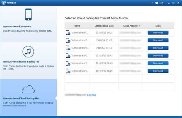 Elija la última opción de la interfaz. Necesita iniciar sesión en tu cuenta de iCloud y verá todos los archivos de copia de seguridad iCloud para todos los dispositivos que tienes. Seleccione el último archivo de copia de seguridad para tu iPhone. Descarga y escanearlo.