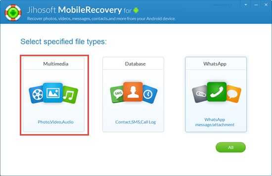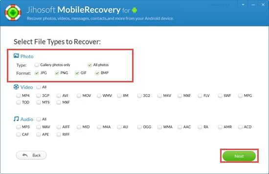 Después de ejecutar la aplicación, haga clic en "Multimedia" en la interfaz. aparecerá una ventana de tipo de archivo. Usted puede optar por el formato de la foto que necesita analizar. Si no recuerda el formato de fotos perdidas, puntea "todas las fotos". Después de la selección, golpeó "Siguiente".
