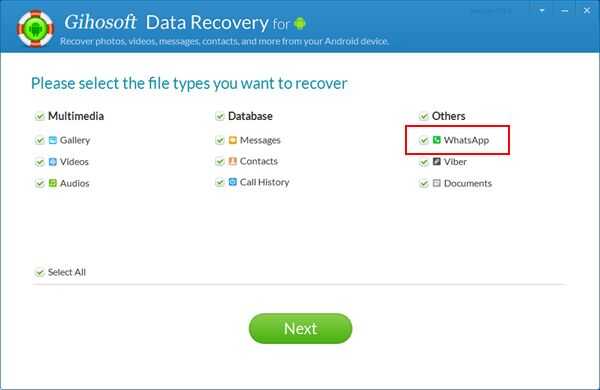 Gihosoft Libre Android Data Recovery es una herramienta útil que facilita a los usuarios de Android recuperar datos perdidos de Android, incluidos los mensajes de WhatsApp. Sin importar el tipo de dispositivo Android está utilizando, como Samsung Galaxy, HTC One, LG, Google Nexus, Sony Xperia, Motorola, Huawei, etc, puede descargar este software gratuito en su computadora y recuperar mensajes WhatsApp, fotos y vídeos en Android.