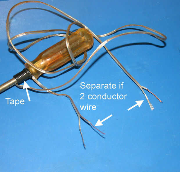 Cortar un trozo de alambre de unos 2-3 pies de largo. Si es un cable de conductores múltiples como el altavoz del 2 conductor utilizado en los cuadros, tira hacia atrás el aislamiento cerca de 1 pulgada y trence los conductores. Para ello en ambos extremos del cable. Asegúrese de dejar los cables pelado en cada extremo. Quieren acabar con el equivalente de una sola longitud de cable con los extremos pelados. Si tienes un cable de un solo núcleo, sólo tira de cada extremo.