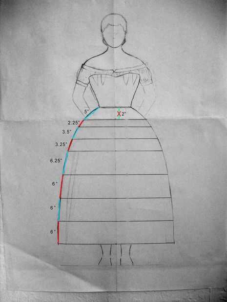 Ahora que ya tienes tu falda aro dibujado como usted guste, usted comenzará a tomar medidas. Va a medir cada espacio entre los aros en el borde lateral de la falda (ver foto arriba por ejemplo). No te olvides de medir la distancia entre el aro superior y la cintura demasiado! Medir directamente desde el borde de un aro a otro, haciendo caso omiso de las curvas. Recuerde, que no desea medir en el centro de su dibujo o terminarás con muy poco espacio entre tus aros. En la foto de arriba, mire el área entre el aro superior y la cintura. Si se mide en el borde, el resultado es 5". Si se mide en el centro, es 2". Es una gran diferencia! Puede escribir estas mediciones directamente en el dibujo o ponerlos en otra hoja de papel, pero asegúrese de que las tienes para más adelante cuando su patrón real.