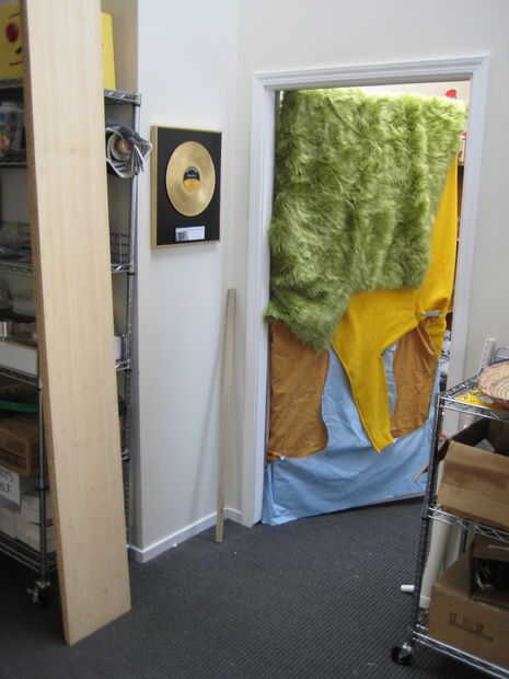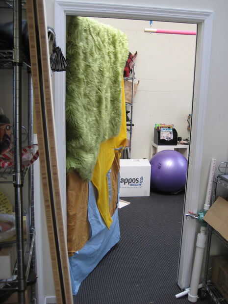 Decidí hacer su oficina un poco más acogedor. Lo más atractivo que pude pensar fue tela furry, pero unfortuately no podía cubrir la puerta entera. Funcionó hacia fuera. Por lo tanto, pensé que lo más atractivo era el fieltro amarillo, pero que no cubre la puerta toda bien. Así, acabé añadiendo algunos lino azul y marrón otras cosas. ¿El efecto?