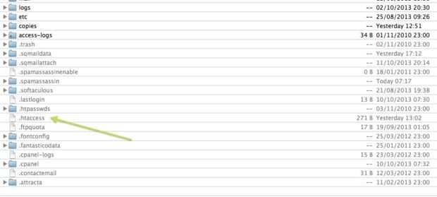 Si no encuentra el archivo, puede que necesite crear uno. Para hacer esto simplemente hacer un espacio en blanco archivo de nombre 'htaccess' y agregarla al nivel superior de su sitio usando su programa de FTP. Una vez que se haya cargado, cambiar el nombre del archivo a ".htaccess" (el punto es importante!) y como de costumbre.