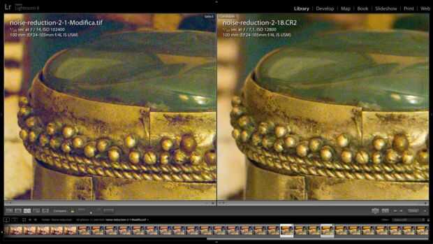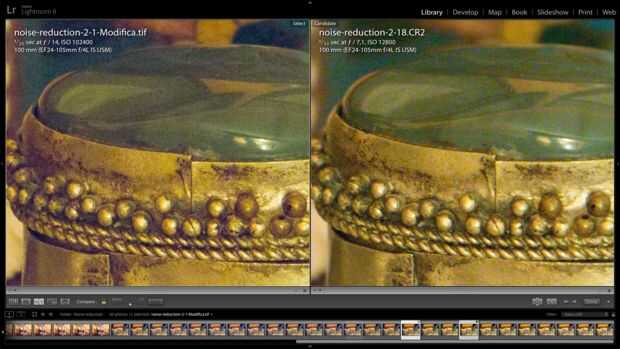 He tomado para este fin otras imágenes con ISO baja (51200, 25600, 12800, 6400, 3200, 1600, 800, 400, 200, 100). He comparado la imagen editada (con ISO 102400 y entonces apilado con otros 14 imágenes) con las imágenes con ISO baja.
