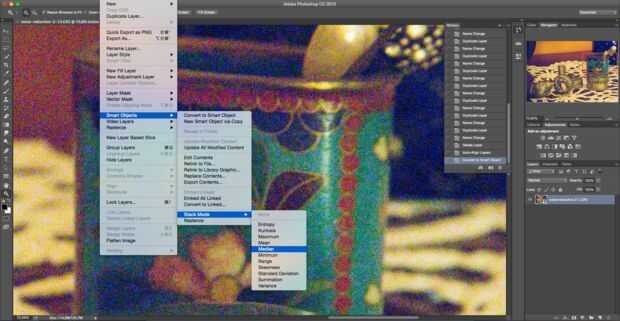 En el paso anterior las fotos fueron apiladas uno sobre el otro. Ahora tienes que elegir el modo de pila, la forma de la imagen final se compone de los apilados. Haga clic en la pila (en el menú superior), objeto inteligente, modo de pila, haga clic en media.