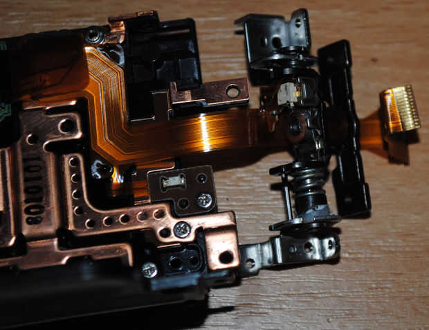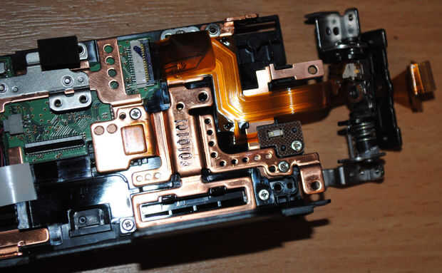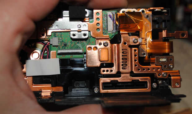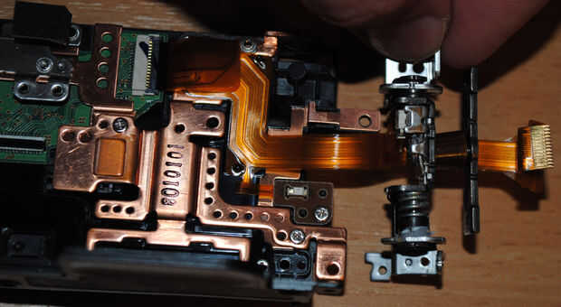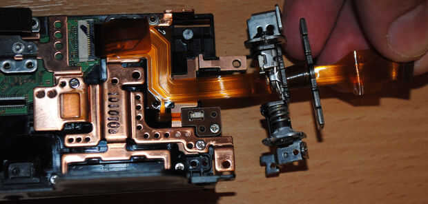 H.Wind el cable nuevo en la bisagra – estudiar las fotos que usted hizo cuando usted sin herida el cable viejo. Coloque la curva de 90 grados de la extremidad del LCD de la articulación. Tenga cuidado en la posición de los contactos metálicos del cable coincida con el conector de la pantalla, tenga cuidado en la posición de la bisagra en relación con el cuerpo de la cámara y la pantalla LCD. No quiero enrolle el cable de más de una vez. Si la curva se coloca correctamente, enrolle el cable en la parte superior de la curva hasta llegar a la siguiente curva de 90 grados. Fije la placa cerca de la segunda curva con un tornillo en la bisagra. Compruebe la posición correcta en las fotos en el viento de las Naciones Unidas.