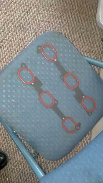 luego agarra su nuevo múltiple de admisión superior e inferior juntas de acoplamiento y ponerlos en asegurarse de que la superficie de contacto es limpio. Por alguna razón las juntas viejas y esos nuevos cubre completamente uno de los orificios completamente. había un poco de material pasta de juntas en estos lugares pero yo no he puesto ninguno de ellos... HACER no tienen ninguna fugas en estas áreas les dejo hasta usted si usted quiere colocar cualquiera allí o no.