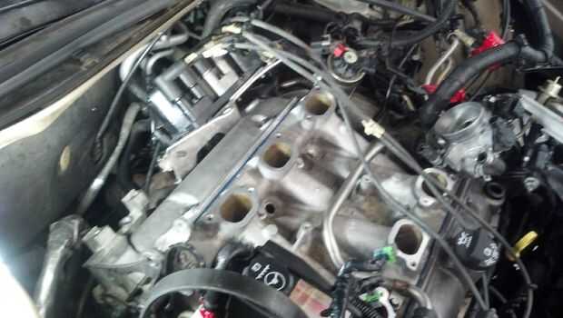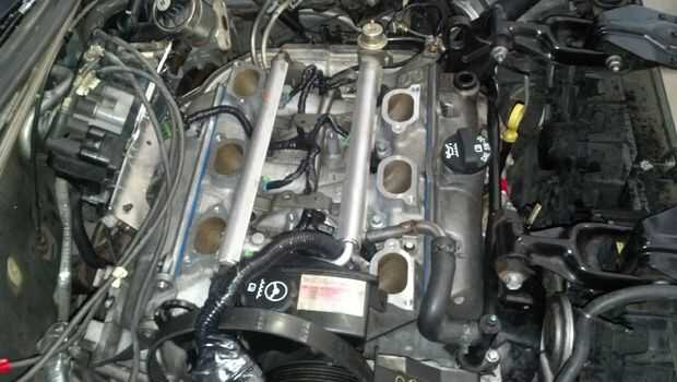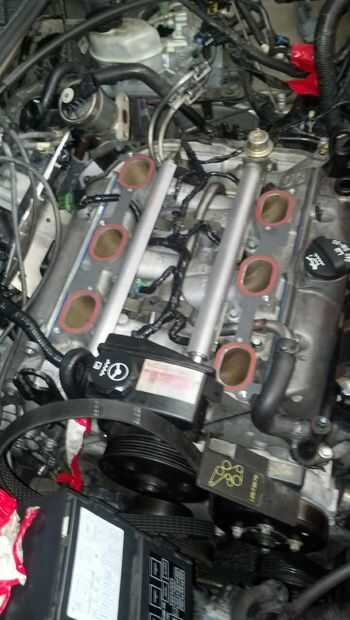 Ahora poner aceite limpio en los dedos y frotar todos los O Rings de los inyectores de combustible que acabo de cambiar. una vez que levante la derecha de la Asamblea del combustible y asegurarse de que todos los inyectores están en el lugar para entrar en sus agujeros, comienzo, empujando hacia abajo en un patrón X, asegurándose de que el arnés para el sensor MAP está por debajo de los rieles de combustible y el arnés para los inyectores es por encima de la placa de montaje.