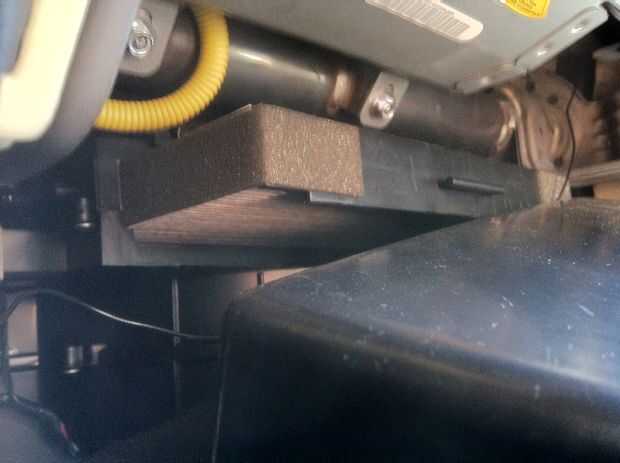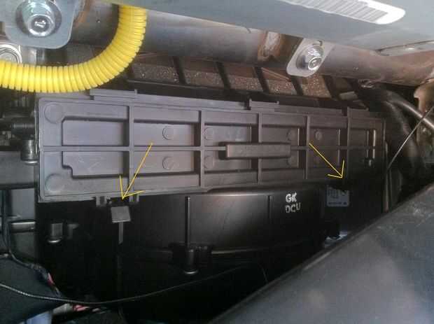 Para quitar la tapa de filtro de aire de cabina, los dos clips en la parte inferior tienen que ser empujado hacia arriba y la tapa tirado hacia fuera y hacia abajo al mismo tiempo. El filtro se desliza hacia fuera fácilmente una vez que la cubierta es de.