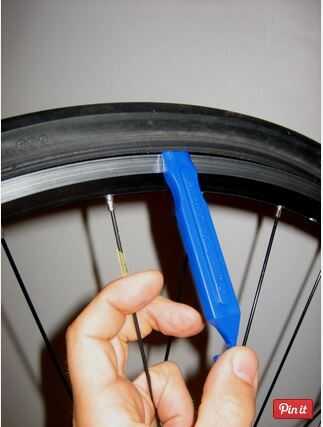 Nota: Si no tienes una palanca de neumático, utilice un pequeño objeto romo (cuchara) se deslice entre el neumático y la llanta.