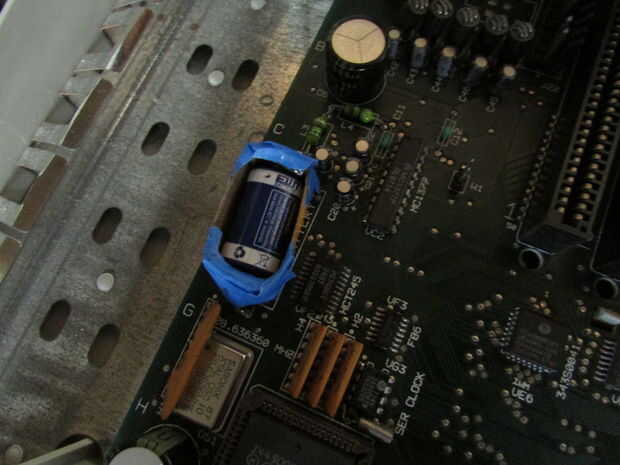 Eso es él! Ojalá hubiera cogido un portapilas, pero no sabía que necesitaría uno. Sostenedor de batería DIY! Algunos cartulina, cinta y papel de aluminio. Encendí el ordenador, la fecha y hora y apagarla. Me volví hacia atrás en, y la fecha siguen igual!