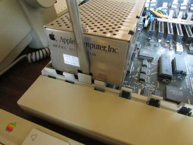 Abra la cubierta IIGS. Im suponiendo que sabe cómo hacerlo. Oh y dejar el cable de alimentación obstruida en mientras te quitas la tapa. Simplemente apagar la computadora. Tocar la centralita (brillante, de color plata) para descargar cualquier electricidad estática. Retire la caja de potencia pulsando la pestaña (frente, fondo) y desenchufe el cable de la Junta. Sáquelo.