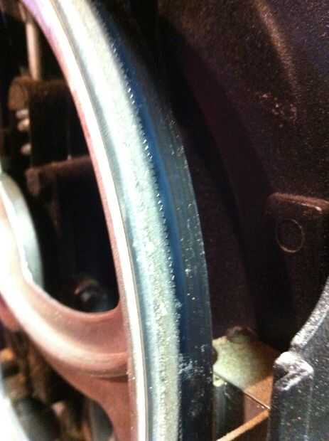 la primera vez utiliza la hoja de 1/8" en mi sierra, no tengo el rodamiento de empuje (detrás de la hoja) situado justo. Casi tan pronto como empecé a cortar la lámina empuja hacia el cojinete de empuje y desafilar los dientes un poco en los bloques