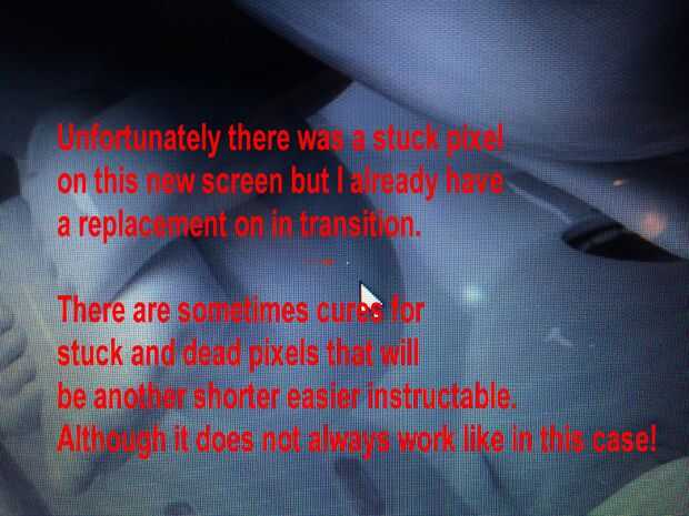 Bien la mayoría de usted sabrá poner la batería, por lo que usted puede saltar a la foto 4 Si consigues ese tema y una palabra de Consejo, que debería haber puesto al principio, pero no era consciente de. La nueva pantalla que menciono en la foto 5 es no en transición la empresa la compré de tener una política donde no sustituir pantallas a menos que tengan más de 5 pixeles pegados o muertos. Dice pixeles muertos en la política, la diferencia es un pixel muerto no enciende y no es tan notable. Un pixel pegado se mantiene encendido en un solo color todo el tiempo que la pantalla está encendida, ve más claro en la foto 6. Acer la india también tienen la misma política no estoy seguro sobre Reino Unido acer y acer nos me enviaron este enlace http://www.acer.co.in/ac/en/IN/content/dead-pixel pero es una empresa británica. También me dijeron "esta es una garantía estándar de pixel muerto que se encuentra con cualquier pantalla". No es cierto!, de todas las muchas pantallas he sustituido, por suerte esta es la segunda que un píxel atascado. Anterior fue sustituido alegremente, por lo que si esta cuestión no está resuelta y que tengo que pagar por otra pantalla, se nombre de la empresa involucrado aquí y también probar y encontrar el que substituido también mi última pantalla pixel defectuoso y poner que también aquí, para que luego pueda decidir que desea comprar de. Hay muchos proveedores de pantallas y si me metía bastante trabajo compraba a granel de un proveedor que es siempre un correo electrónico a me, pero no consigue habitualmente más de dos pantallas a la semana si eso. De grueso que puede todo cambiar con este instructable, seguramente no todo el mundo que lee esto querrá cambiar su propia pantalla. Visto cuál es involucrados. Por todos los medios comprar fuera de ebay pero Compruebe la política primero y la puntuación de retroalimentación.