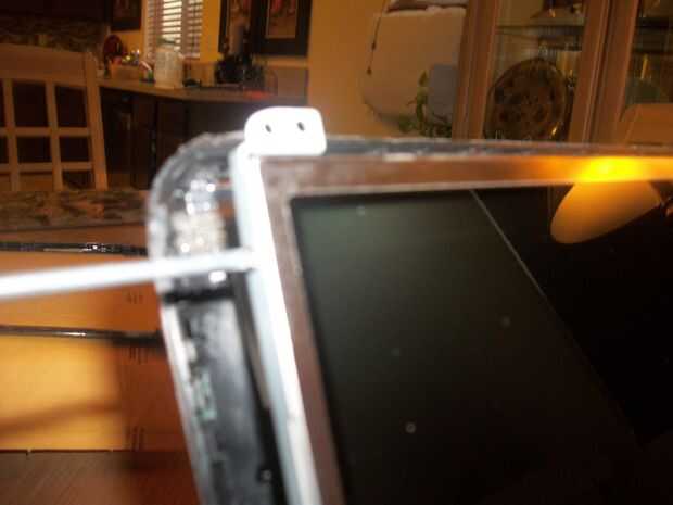 ahora que tienes la parte superior desenroscarse y suelta la parte inferior para tener cierto margen de juego, empuje suavemente la parte posterior del marco de la abrazadera por lo que se pueden desenroscar los tornillos de la parte inferior del soporte con monitor en lugar de trabajo, el de un lado a otro
