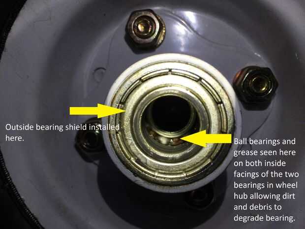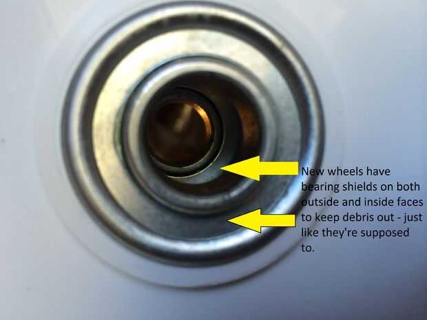 La primera imagen muestra las partes que salió mal. Cada rueda tiene 2 rodamientos, uno en el exterior y otro en el interior del cubo de la rueda. Son 'presión' en el lugar. Lo que significa que una máquina mucho más fuerte que me los ha golpeado en los extremos de los ejes, haciéndolo esencialmente imposible para la persona promedio retirar y colocar los rodamientos viejos sin destruir el cubo y la rueda. La segunda imagen muestra la vista a través del eje de rueda original mirando el interior cara del cojinete en el extremo. No hay ningún metal cubierta (escudo) sobre los rodamientos de bolas envasados grasa. Es sólo una cuestión de tiempo antes de un rodamiento como esta expuesto a la suciedad exterior y mugre se pueden atascar y destruir el cojinete. La tercera imagen muestra el interior del rodamiento de la rueda de nuevo en comparación.