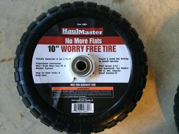 Estas son las ruedas de recambio que encontré en el puerto de carga. HaulMaster 10" te preocupes libre llantas modelo #96691. Son iguales fuera de diámetro (10"), mismo ancho y tienen el mismo 5/8" diámetro que los originales. Si no tienes una tienda de Puerto carga cercana, usted puede probablemente pedirlos en línea. Asegúrese de ordenar el tamaño correcto de chavetas del siguiente paso a la vez. Estas ruedas tienen un eje de longitud ligeramente más larga por lo que sólo tendremos que retirar el espaciador de viejo para que se ajuste. Si tienes una tienda cerca, toma el volante viejo con usted. Inspeccione las ruedas en la tienda y girar ambos cojinetes en el eje para asegurarse de que tienes una buena. Aunque estos son ruedas probablemente mejores que los originales, aún no exactamente son premium y debe inspeccionarlos ocasionalmente y asegurar que aún girar bien. No tener la tentación de utilizar las ruedas de la cortadora de césped de plástico duro, no están diseñados para mucho peso y se agrietará bajo presión. Algunos de ellos ni siquiera tienen rodamientos en ellos.
