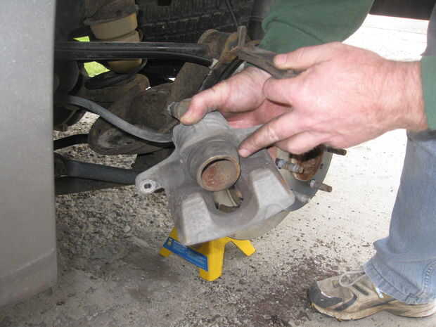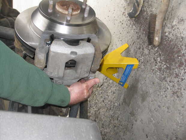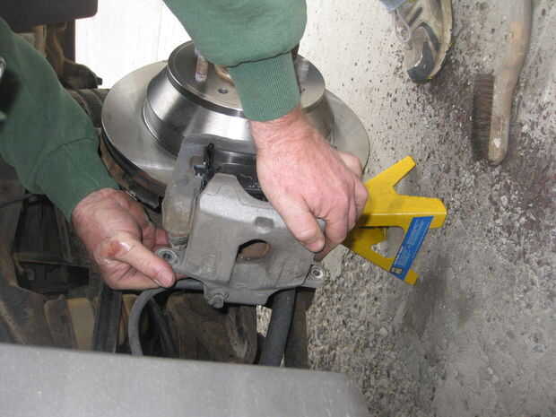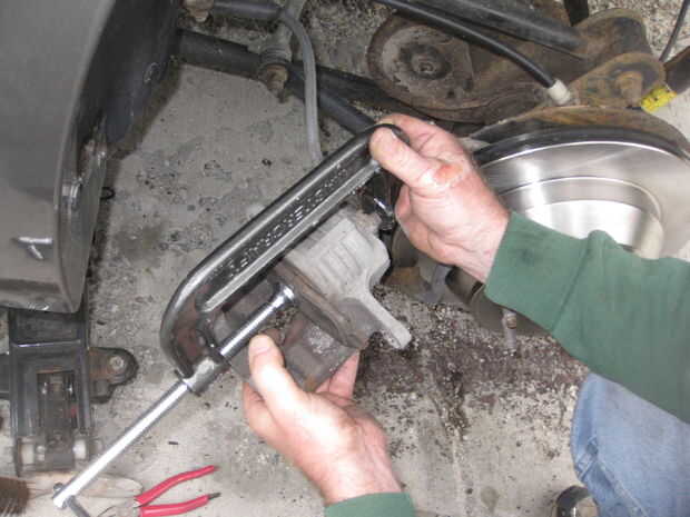 Primero tome una de las viejas pastillas y colocarlo sobre la pieza circular de la pinza (a lo largo), luego tomar la C-clamp y coloque un lado tocar la almohadilla de freno viejo y otro en el otro extremo de la pinza. Apriete la abrazadera c hasta que la broca circular quede al ras con el lado de la pinza. Luego vuelva a colocar la pinza en posición y apriete los pernos a la torsión requerida con la llave dinamométrica.
