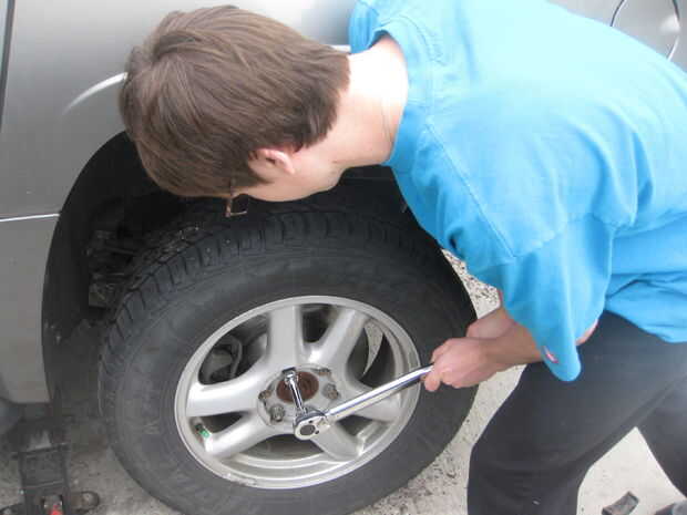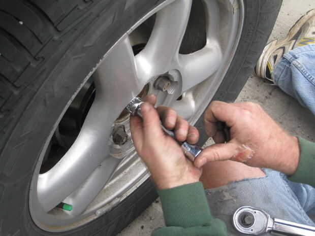La eliminación de la rueda consiste en utilizar un trinquete y el zócalo para deshacer todos los pernos que sujetan la rueda en y luego, levantando la rueda. Sacar los pernos uno frente a otro, encender con la parte superior derecha y despegue inferior izquierda luego abajo a la derecha luego a la parte superior izquierda (no estoy seguro esto es necesario pero que es lo que te los pones y práctica es buena).