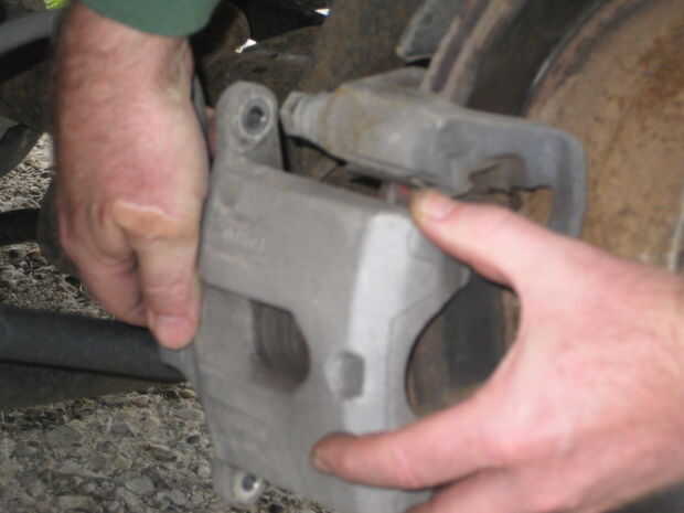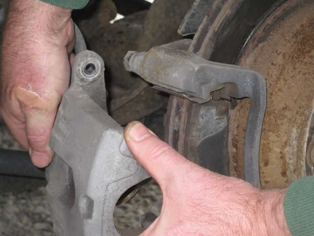 Deshacer los pernos que sujetan la pinza es un relativamente fácil (no como ese soporte de la almohadilla) y luego retirar las almohadillas también es fácil. Para quitar la pastillas de freno saca el metal pequeño clips que mantienen las pastillas en su lugar entonces las pastillas salen fácilmente. Si hay una ranura en las almohadillas son todavía Dios (uno grande en el medio, no un montón de pequeños todo alrededor).