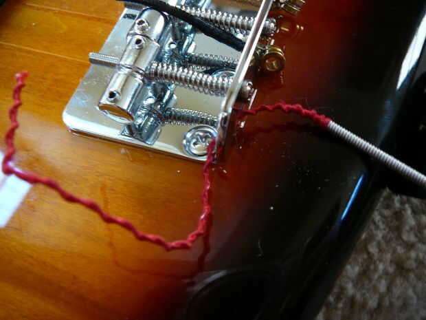 o tirar la cadena por la parte trasera del puente o a través del cuerpo. Empuje la nueva cuerda por el agujero del puente o el cuerpo.