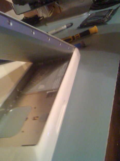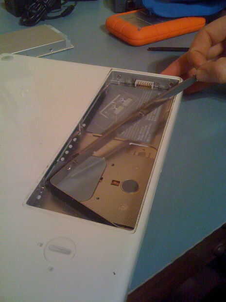 Después de haber extraído la batería es hora de retirar el protector de la RAM. Hay 3 tornillos que deben quitarse primero. Una vez el tornillo 3 retirarse pull (el tornillo #1 en la foto) hacia la parte delantera de la máquina. Que se asiente en el metal en la parte frontal, asegúrese de que saque desde este ángulo y no doble la pestaña.