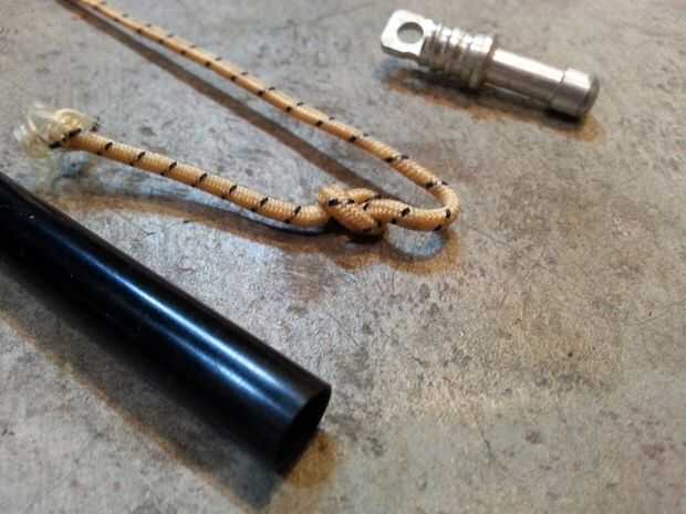 Toma una respiración profunda... Tire dos secciones de polos separados y cortar el cordón. El polo va a separar en trozos individuales (mina tiene 8 secciones por polo, y solamente las secciones de dos extremos son diferentes, así que me aseguré que los separe). Tire de la clavija en el extremo del poste, debe ver el extremo del pie de la cuerda, anudada y conectado a la clavija. Mis clavijas se rosca, así que tuve que aflojar de las secciones del poste.