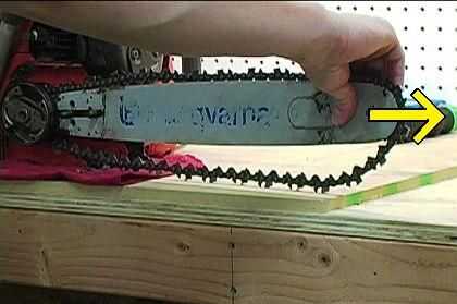 Con la cadena correctamente roscada a lo largo de la guía y del tambor del embrague bar, pone cierta tensión en él tirando de la nariz de la barra de la motosierra.