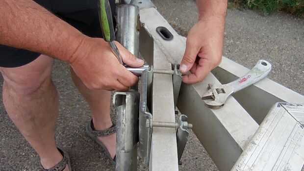 Quite al viejo gato de la horquilla basculante. Mi nuevo gato de la horquilla basculante vino con todo el hardware de montaje, por lo que no necesito volver a utilizar alguno de los pernos o tuercas. Asegúrese de comprobar lo que sale con la suya. Si el hardware viejo necesita a ser reutilizada, ahora sería un buen momento para inspeccionar y reemplazar cualquier cosa que se usa.
