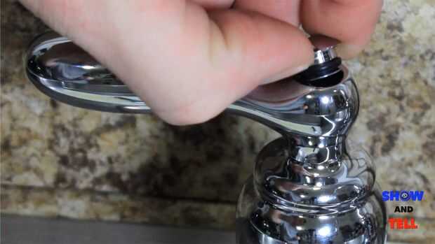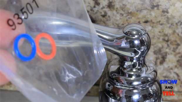 Añadir los indicadores de temperatura de rojo y azul a las manijas de la llave. Las instrucciones demostraron apalancamiento con un destornillador, pero que es innecesario y puede rayar el acabado.