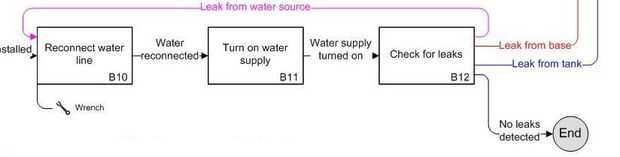 Si hay desde el tanque de volver al paso 9. Si hay fugas de la base, volver al paso 10. Si hay fugas de la fuente de agua volver a paso 16