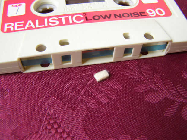 Es ese pequeño protector de fieltro rectangular en pic 1. Puede venir en varios colores diferentes y se encuentra debajo de la cinta en el centro del lado expuesto del cassette. Se pega a una placa de metal pequeña primavera. Todos los cassettes están diseñados así con sólo una excepción, muy viejos casetes de marca Memorex. Utilizan un bloque de esponja goofy con ninguna placa de resorte que es un tema completamente diferente para reemplazar y no cubiertos aquí. Cualquier cinta adhesiva que encontró que utiliza el bloque de esponja grande fue hecho por Memorex. Foto 2 muestra una vista de la cinta que falta su almohadilla de presión.
