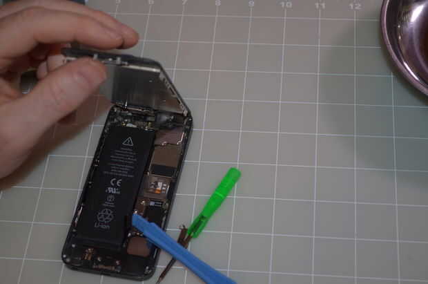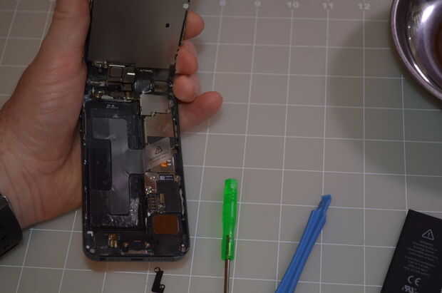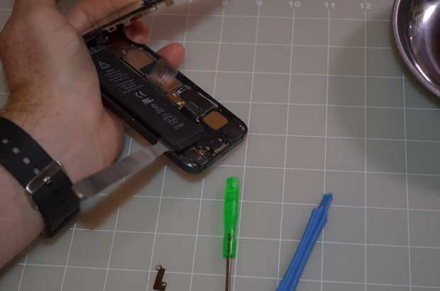 Puede simplemente levantarse en esa pestaña y que salen. No fui tan afortunado. Tuve que usar otro prybar en el otro lado de la batería para separar el pegamento. Este tipo de desordenado la pestaña y adhesivo, así que intenté ponerlos detrás donde estaban.